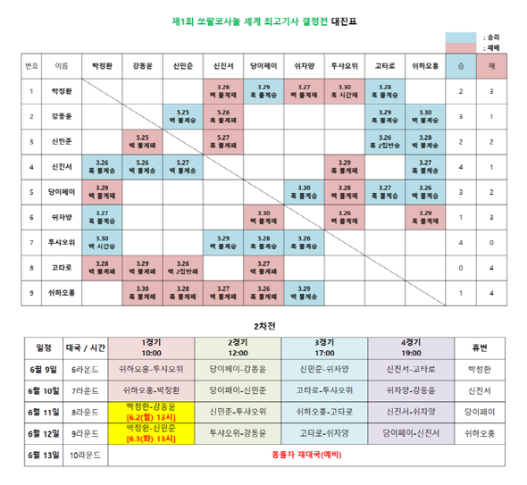 한편, 신진서 9단은 투샤오위 9단에게 패했으나 이후 한ㆍ한전 2경기에서 모두 승리해 4승 1패로 상위권에 안착했다. 2연승으로 한숨 돌린 신진서 9단은 2차전에서 만날 중국의 당이페이 9단, 쉬자양 9단, 일본 후쿠오카 고타로 7단과의 경기로 결승 진출을 노린다.
