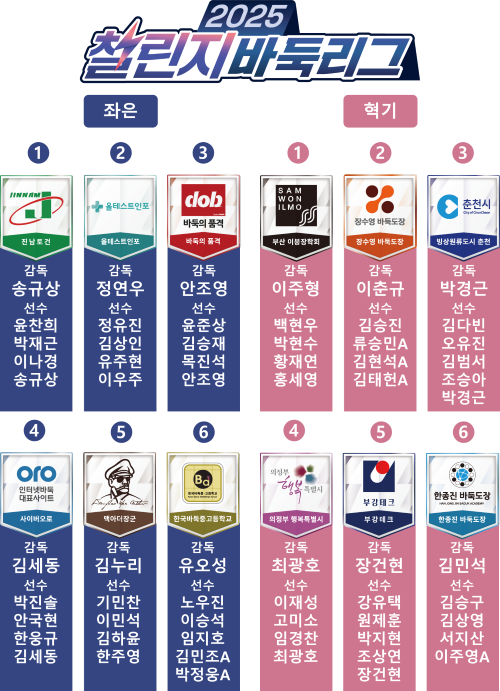 2025 챌린지 바둑리그는 6월 21일과 22일 철원에서 열리는 개막식과 1~4라운드(4쿼터 릴레이 대국)를 시작으로 정규리그에 돌입한다. 이후 7월 6일 춘천에서 5ㆍ6라운드(4쿼터 릴레이 대국)를 치르고, 7월 중순부터는 남은 1대 1 대항전(3판 다승제) 5라운드를 진행해 정규리그를 마무리할 예정이다.