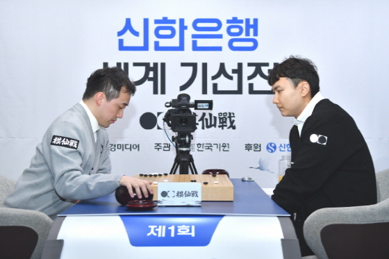 ▲제1회 신한은행 세계 기선전 16강전 중국 양카이원 9단(왼쪽)vs박정환 9단(오른쪽 승)