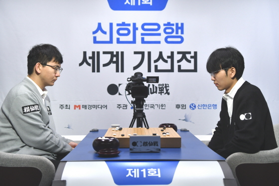▲제1회 신한은행 세계 기선전 16강전 중국 딩하오 9단(왼쪽)vs신진서 9단(오른쪽 승)