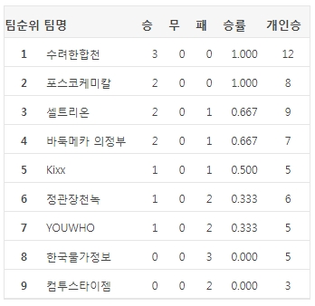 믿는 주장 박정환 9단이 중심을 잡고 있는 수려한합천은 새롭게 보강한 주전들이 탄탄한 호흡를 맞추며 단숨에 3연승 선두로 뛰어올랐다. 첫 경기를 기세 좋게 출발한 킥스는 5지명 김세동 8단만이 나현 9단을 상대로 승리하며 1승1패.