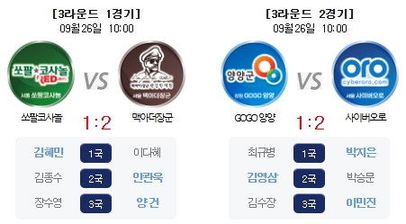 또한 2라운드까지 1승1패에서 나란히 승리하며 2승1패가 된 수소도시완주와 의정부행복특별시가 동점 처리 규정에 의해 2위와 3위. 2패 팀 중에서 일요일 행사를 앞둔 맥아더장군팀은 쏘팔코사놀을 2-1로 꺾으며 환호한 반면 GOGO양양은 개막 3연패에 빠지면서 조대현 감독의 시름이 깊어졌다.