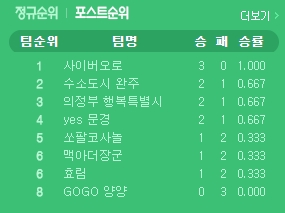 8개팀이 더블리그로 포스트시즌에 진출할 네 팀을 가려내는 정규시즌은 내주 월요일(29일) 4라운드를 통합경기로 일제히 벌인다. 대진은 효림-맥아더장군, 쏘팔코사놀-수소도시완주, 의정부행복특별시-사이버오로, 예스문경-GOGO양양.
