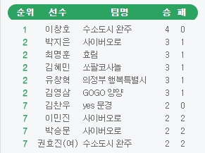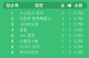 이어 이창호 9단이 이끄는 수소도시완주가 1승2패의 쏘팔코사놀을 2-1로 꺾으면서 세 팀이 3승1패 동률. 동점 처리 규정에 의해 수소도시완주, 의정부행복특별시, 사이버오로 순으로 1~3위가 결정됐다.