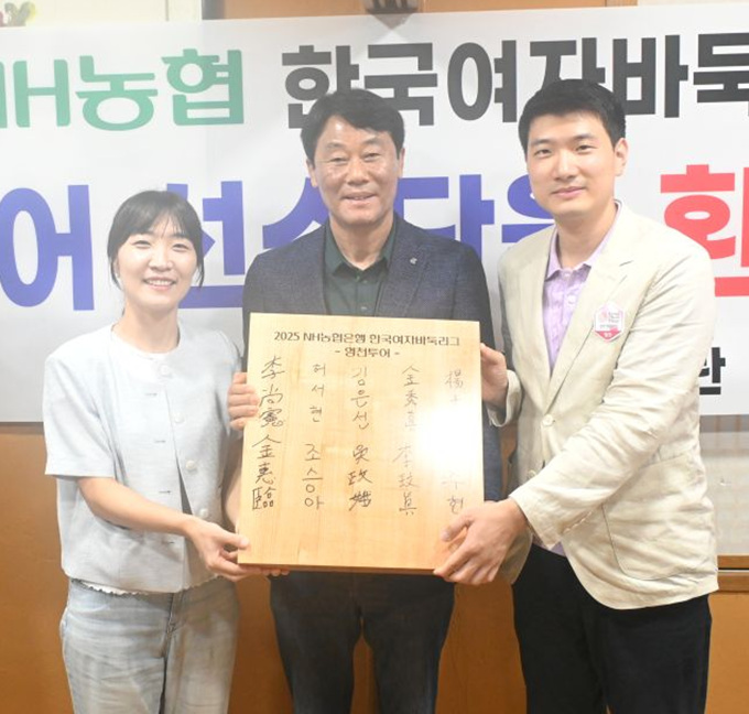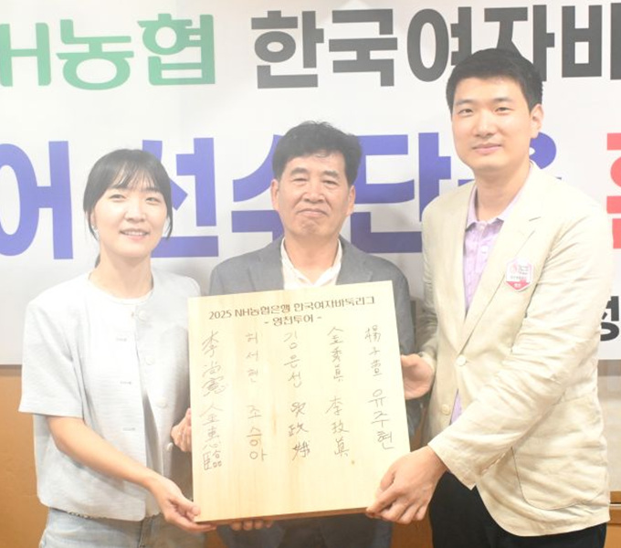 ▲ 박봉규 영천시 체육회장이(가운데) 선수들의 사인이 적힌 바둑판을 선물받고 있다.