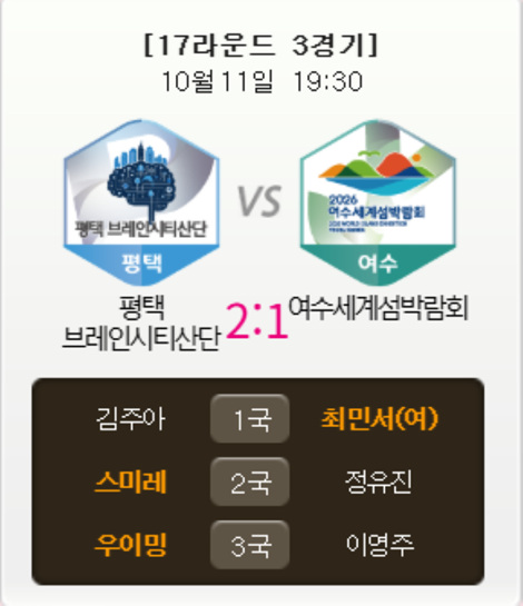▲ 17라운드 3경기 3국 속기 평택 브레인시티산단 우이밍(승) vs 여수세계섬박람회 이영주