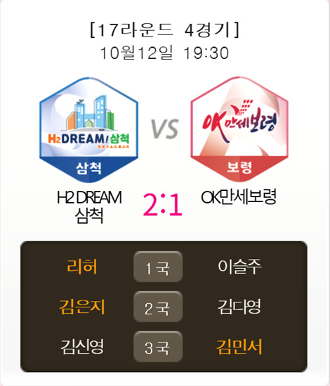 17라운드 4경기에서 H2 DREAM 삼척이 OK만세보령을 2-1로 꺾으며 정규리그 2위 경쟁에 불을 지폈다. 이날 승리로 삼척은 승점을 추가하며 2위 쟁탈전에 불을 지폈고, 보령은 포스트시즌 진출을 위해 마지막 라운드에서 반전이 필요한 상황이다.