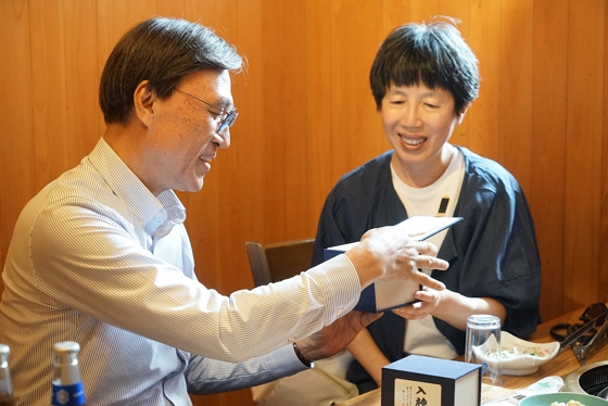 ▲ 경기 후 식사 자리에서 루이나이웨이 9단이 권진수 단장에게 직접 휘호한 찻잔을 선물했다.