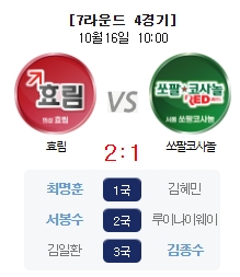 전반기 마지막 경기로 16일 오전에 열린 7라운드 4경기에서는 효림이 쏘팔코사놀을 꺾었다. 쏘팔코사놀에 선제점을 내준 다음 원투 펀치 최명훈 9단과 서봉수 9단이 내리 승리하며 2-1 승리를 가져왔다.