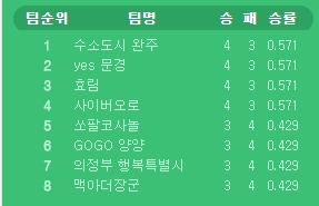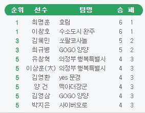 한편 개인 성적에서는 이창호 9단과 최명훈 9단이 6승1패로 공동 선두, 그 뒤를 5승2패의 김혜민 9단과 최규병 9단이 쫓고 있다. 4년 연속 다승왕이었던 유창혁 9단은 4승3패로 한 걸음 뒤.