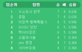 먼저 완주와 효림이 나란히 7승째(4패). 이어 5승5패의 의정부행복특별시가 사이버오로를 5연패의 수렁에 밀어넣으며 6승째로 올라섰다.