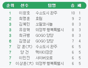 개인 다승에서는 이창호 9단이 10승1패로 1위. 그 뒤를 9승2패의 최명훈 9단이 바짝 쫓고 있다. 유창혁 9단과 김혜민 9단, 최규병 9단은 8승3패로 한걸음 뒤.