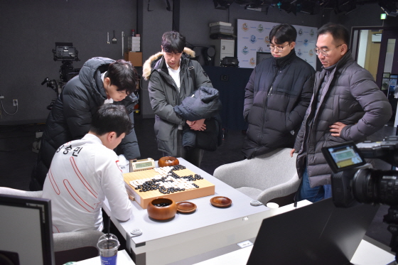 ▲ 4국 종료 후, 사복으로 환복한 영림 선수단이 강승민과 함께 패배의 아쉬움을 복기로 달래고 있다.
