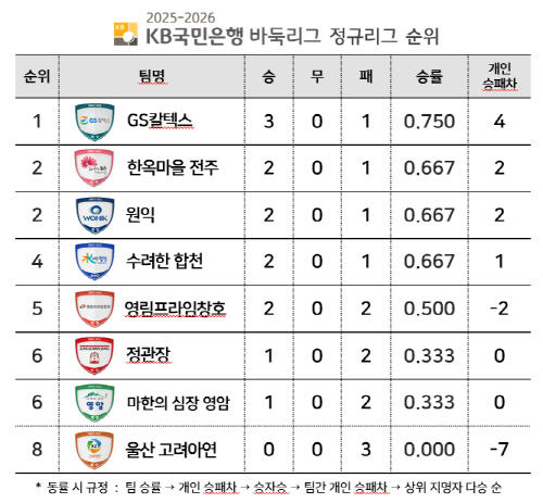 삼성화재배로 짧은 휴식기를 가진 바둑리그가 4라운드를 재개했다. 20일 한국기원 바둑TV 스튜디오에서 열린 2025-2026 KB국민은행 바둑리그 4라운드 1경기에서 GS칼텍스가 영림프라임창호를 3-1로 꺾고, 단독 선두로 뛰어 올랐다.