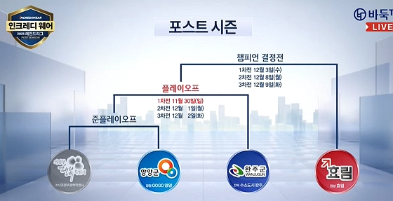 10승4패로 정규시즌 1위에 오른 효림부터 7승7패로 아슬아슬하게 막차를 탄 의정부행복특별시까지 각기 다른 출발점에서 계단식 대결로 최종 순위를 다툰다.