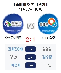 3전2선승제로 치르는 플레이오프는 12월 1일 오전에 2차전을 속행한다. GOGO양양이 반격에 성공하면 2일 저녁에 최종 3차전을 벌인다. 챔피언결정전에는 정규시즌 1위 효림이 기다리고 있다.