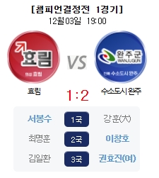 정규리그 1위와 2위가 마주한 챔피언결정전에서 수소도시완주는 효림의 서봉수 9단에게 선제점을 내주었으나, 이창호 9단이 최명훈 9단을 꺾고 동점을 만든 다음 권효진 8단이 김일환 9단을 꺾는 결승점으로 1차전을 제압했다.