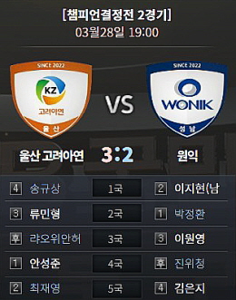 원익은 급한 불을 끄기 위해 주장 박정환을 투입했다. 지난 시즌부터 포스트시즌 6연승 중인 박정환은 한창 물이 올라 있다. 울산 고려아연은 정규리그 6승 3패로 팀의 허리를 책임진 류민형을 내세웠다. 두 선수의 상대 전적 역시 박정환이 7전 전승으로 일방적 우위.