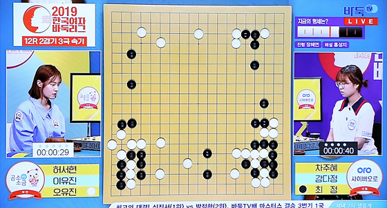 차주혜(흑)-허서현(백)의 장고대국 역시 전반기의 리턴매치였는데 허서현이 전반기의 승리를 재현하며 팀의 승리도 결정했다. 차주혜는 대국초반 침착한 반면운영으로 전국을 리드했으나 중반으로 접어들어 중앙 백 일단을 향한 공격이 실패하면서 빠르게 무너졌다. 각각 우변과 하변에 큰 세력을 구축해 단순하게 갈라진 국면의 경계가 결정되고 집의 윤곽이 확실해지면서 승부도 끝이 났다. 승리한 <부안 곰소소금>은 가장 먼저 8승 고지에 오르며 1위로 복귀했고 패한 <서울 사이버오로>는 4위로 한 계단 내려앉았다. 2019 한국여자바둑리그는 1~4위 팀이 승차 없이 물고 물리는 각축전을 펼치고 있어 최종라운드에 접어들어야 우승팀이 드러날 것 같다.