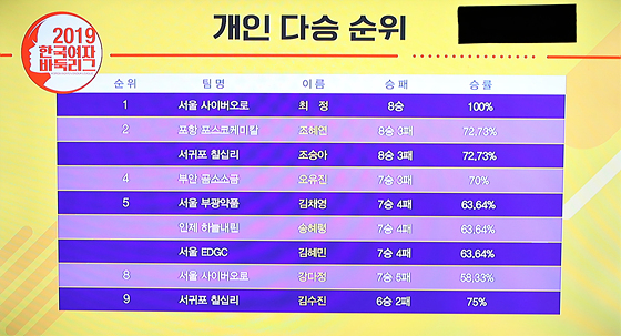 팀의 승부와 무관하게 된 장고대국에서는 오정아가 강지수를 꺾고 3연패의 사슬을 끊으며 팀의 영패를 막았다. <서귀포 칠십리>로서는 1주전이 연패의 늪에서 벗어나 정상의 승부감각을 회복했다는 것으로 만족해야 할 듯. <부안 곰소소금>에 뒤이어 8승을 기록한 <포항 포스코케미칼>은 개인 승수에서 앞서 <부안 곰소소금>을 밀어내고 1위에 올랐다.