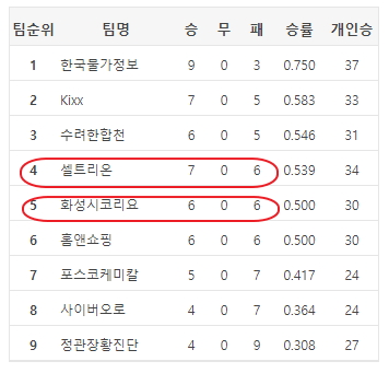 이 밖에 셀트리온은 한상훈 8단이 혹독했던 6연패의 사슬을 끊어내고, 퓨처스 이호승 4단은 전반기에 이어 다시 원성진 9단을 꺾는 등 잇단 경사에 환호하며 4연패 후의 3연승 축포를 쏘아올렸다. 혼돈의 6승 대열을 벗어나 7승에 안착하며 7위까지 밀렸던 순위도 4위로 끌어올렸다. 2위 Kixx(7승5패)와는 불과 반 게임차. 백대현 감독은 "선두 물가정보 외에는 승수 차이가 거의 없기 때문에 2위를 목표로 매진하겠다"는 포부를 밝혔다.