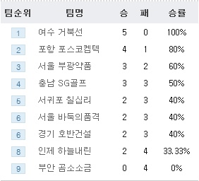 결국 포항 포스코켐텍이 2:1로 승리를 거두고 4승에 도달하며 단독 2위의 자리를 굳건히 지키고 있다. 작년에도 6라운드까지 여수 거북선과 포항 포스코켐텍이 1,2위의 자리를 지켰는데 올해도 똑같은 현상이 벌어지고 있다. 1, 2위 두 팀의 맞대결은 다음 주에 28일(수) 통합 7라운드를 치른 뒤 30일(금) 8라운드에서 여수투어로 펼쳐질 예정이다.