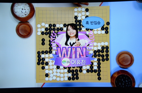 ▲ 첫번째 승리를 거둔 이유진 초단의 승리 세레모니. 흑집은 57집, 백집은 50집으로 흑의 반집 승리이다.