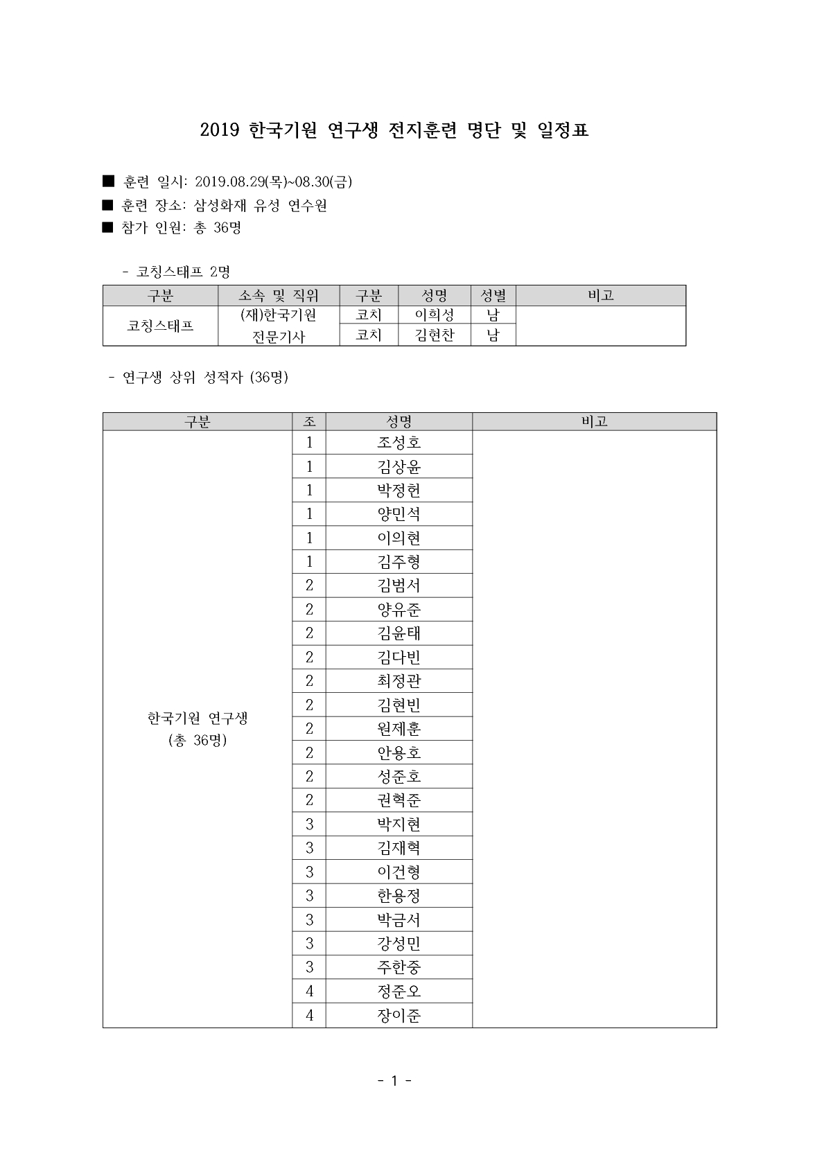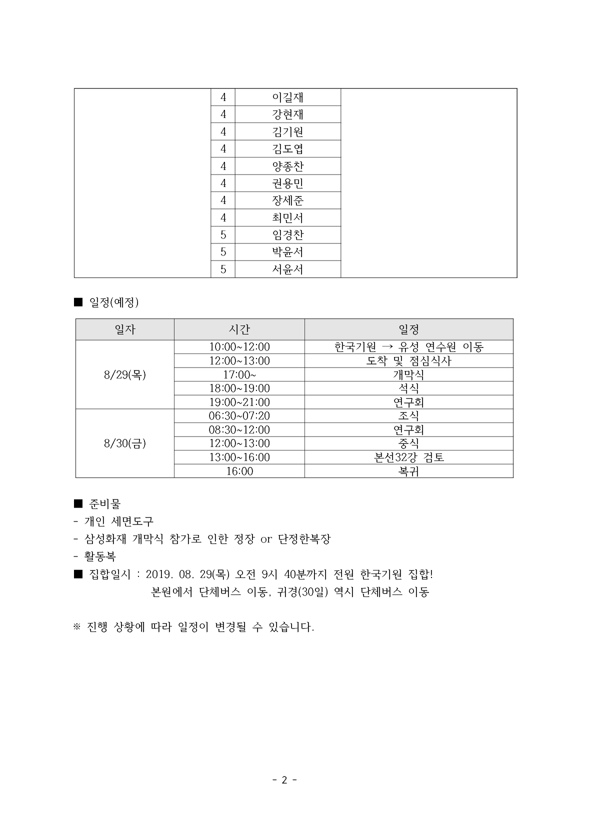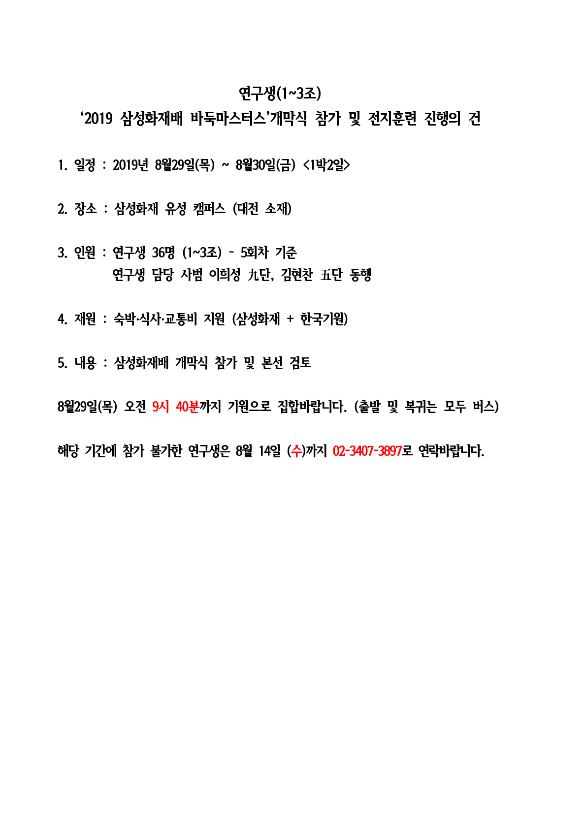 연구생 '2019 삼성화재배 바둑 마스터스' 개막식 참가 및 전지훈련 명단