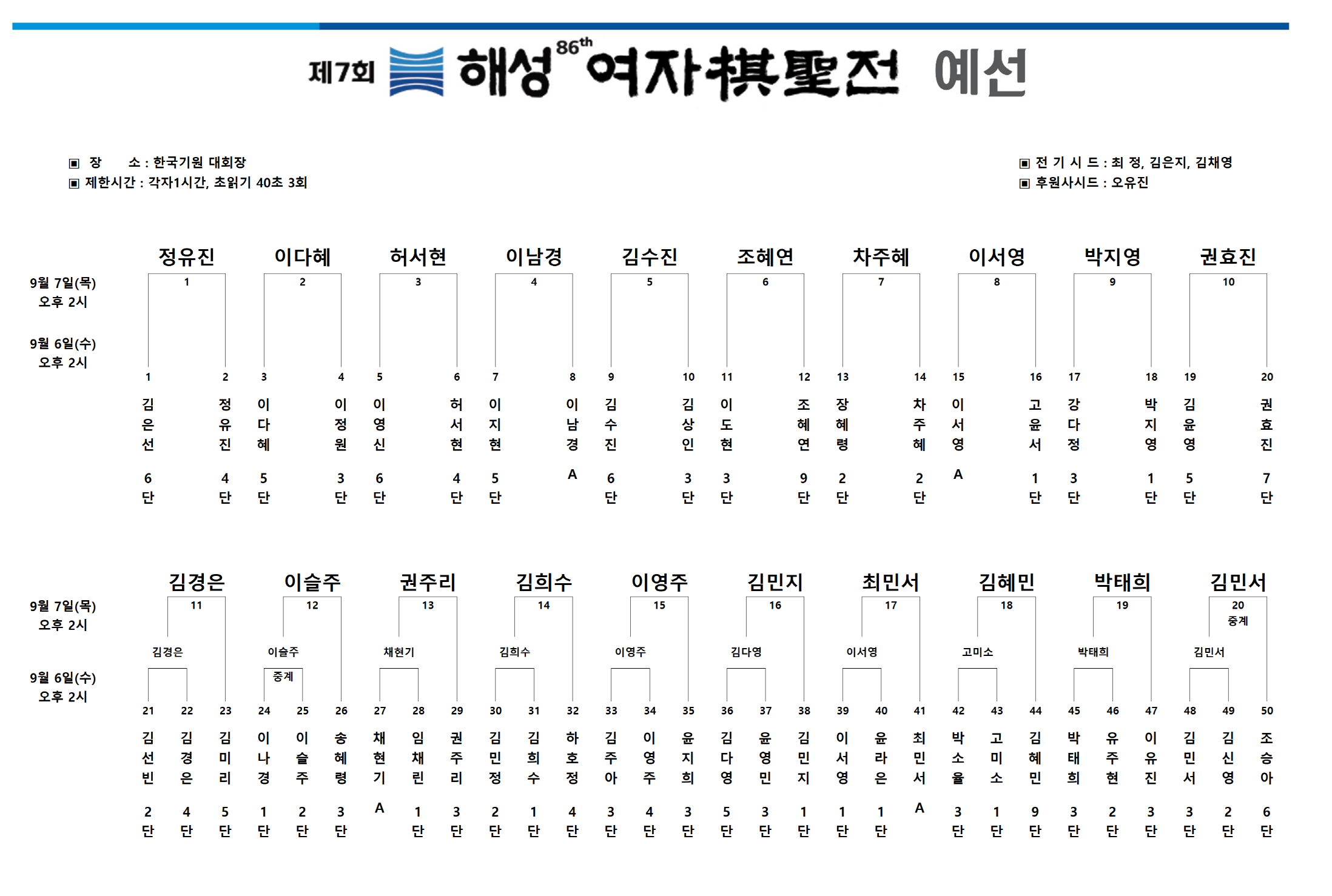 제7회 해성 여자棋聖전 예선 대진표(0907)