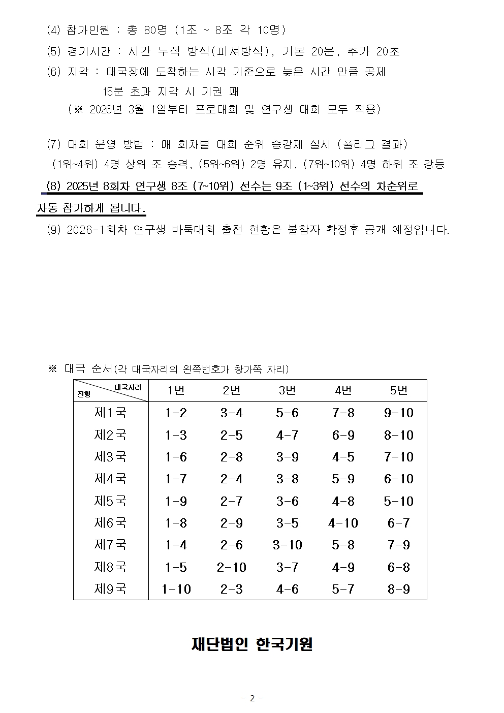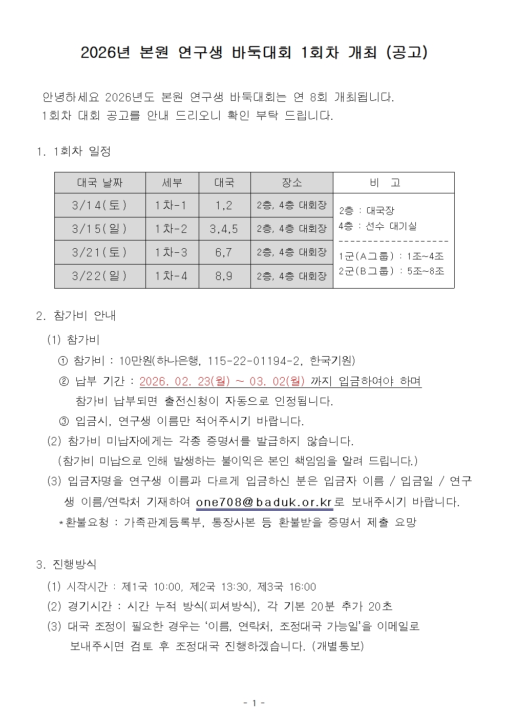 2026년 본원 연구생 바둑대회 1회차 개최 공고
