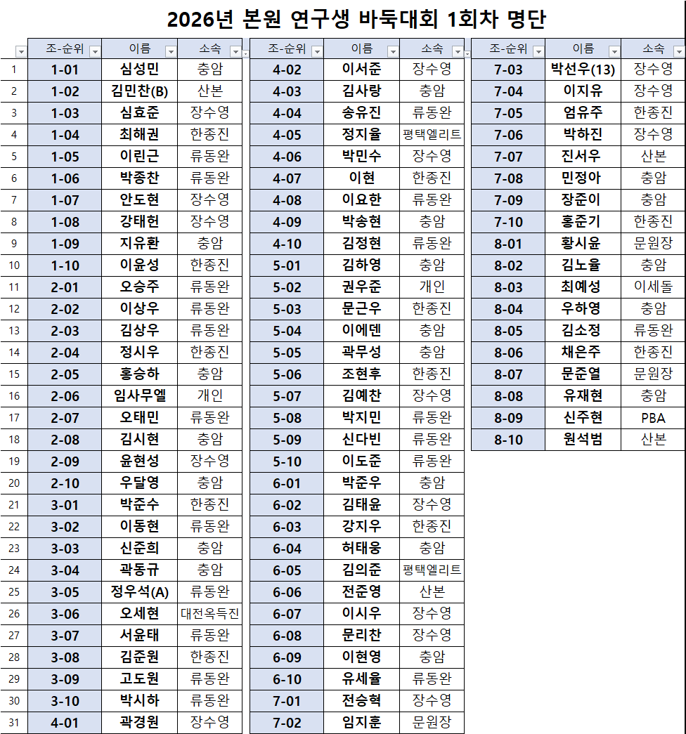 2026년 본원 연구생 바둑대회 1회차 명단